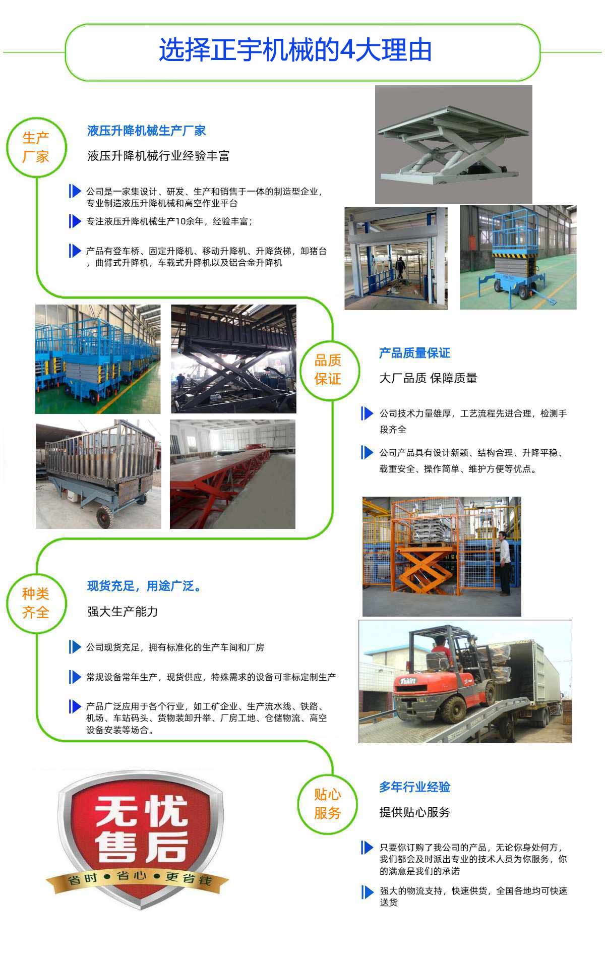 濟南正宇升降機械有限公司是一家集設計、研發、生產和銷售于一體的制造型企業,生產液壓升降機械和高空作業平臺,公司處于素有泉城美稱的山東省濟南市,坐落于濟北開發區。優越的地理位置和便利的交通給公司的發展帶來了充分的條件。正宇液壓技術力量厚,工藝流程先進合理,檢測手段齊全。目前主要產品有:高空作業平臺、登車橋、固定升降機、移動升降機以及鋁合金升降機等等。公司產品具有設計新穎、結構合理、升降平穩、載重安全、操作簡單、維護方便等優點。產品廣泛應用于各個行業,如工礦企業、生產流水線、鐵路、機場、車站碼頭、貨物裝卸升舉、廠房工地、倉儲物流、高空設備安裝等場合。公司以誠信、創新、穩健為宗旨,以品質、完善服務的理念,迎接市場的挑戰。期待您的咨詢!
